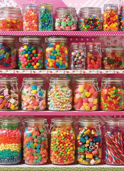 Ages 8+ MADE IN THE US: Cobble Hill Puzzles are proudly manufactured in the USA. RANDOM-CUT PIECES: This piece design means each puzzle piece looks different - A fun challenge. HIGH-QUALITY MATERIAL: The glare-reducing linen paper and crisp image make it a perfect piece to frame. EARTH FRIENDLY: All cardboard is made from 100% recycled material. Our ink is also vegetable based. NO INSTRUCTIONS REQUIRED: Simply use the box cover or convenient linen print poster included. Finished size is 26.625" x 39.25” Poster Size: 17.5" x 11.8" Candy Shelf is a 500-piece Cobble Hill truly original photo puzzle that's sure to satisfy any sweet tooth.