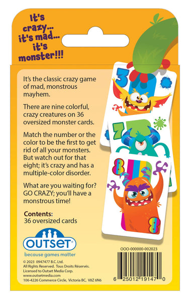 Go wild with Crazy 8’s—the monstrously fun card game of chaos and quick thinking! Packed with silly, colorful monsters, this game is all about matching numbers or colors to get rid of your cards. But watch out... that wild, multicolored Eight can turn the game upside down in an instant!