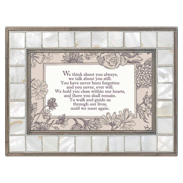 Stunningly Beautiful, This Music Box Features Natural Mother-Of-Pearl Inlay With Silver Beaded Trim. Sides Of Lid And Box Have A Soft Metallic Warm Gray Brushed Finish. Comes With A Lovely Art Print, Under Glass, That Displays Text: We Think About You Always, We Talk About You Still. You Have Never Been Forgotten And You Never, Ever Will. We Hold You Close Within Our Hearts, And There You Shall Remain. To Walk And Guide Us Through Our Lives, Until We Meet Again. Print Can Be Changed Out For A Favorite 6X4 Photo. Inside Box Is A Small Compartment With Clear Glass Top That Shows The High Quality Sankyo Musical Movement. When Key Under Box Is Wound, Music Will Play When Open And Stop When Closed. Song: Wind Beneath My Wings. Storage Compartment Has A Luxurious Black Velvety Lining. Decorative Padded Silver Tone Legs On Bottom To Protect Furniture. Box Is Made Of A Super-Sturdy Polymer That Resists Cracking And Chipping. Overall Size Is 8 X 6 X 2-3/4. Comes Packed In A White Or Brown Box.