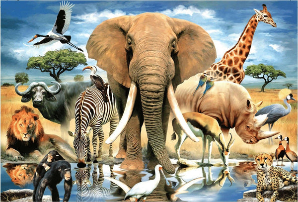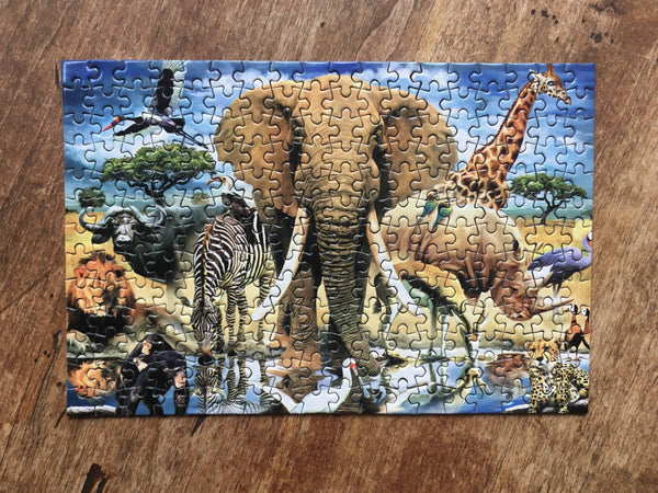 This is a mini puzzle with tiny pieces. While it is small, it can take an afternoon to assemble. This puzzle is great for those that enjoy puzzling, but don't want to sacrifice a whole table top for assembling a puzzle. This one doesn't take up much space, but will still provide you with hours of entertainment. It comes with a set of plastic tweezers that you will need to assemble the puzzle. African Oasis by Howard Robinson is a die-cut puzzle that depicts African animals like elephants, zebra and giraffes near a watering hole. Each piece is small enough to fit on the tip of your finger, making this the ultimate challenge to test your patience. Makes a great stocking stuffer.