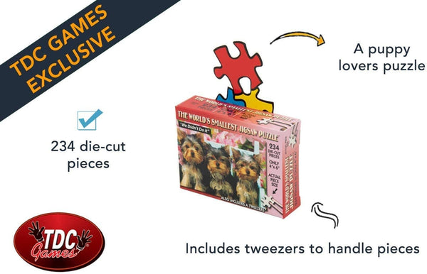 This is a mini puzzle with tiny pieces. While it is small, it can take an afternoon to assemble. This puzzle is great for those that enjoy puzzling, but don't want to sacrifice a whole table top for assembling a puzzle. This one doesn't take up much space, but will still provide you with hours of entertainment. It comes with a set of plastic tweezers that you will need to assemble the puzzle. We Didn't Do It depicts some adorable mischievous puppies in a garden. This die-cut puzzle is perfect for any puppy lover.Each piece is small enough to fit on the tip of your finger, making this the ultimate challenge to test your patience. Makes a great stocking stuffer.