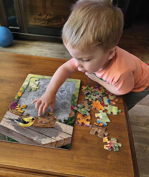 One of our most popular Easy Handling 275-piece puzzles is now available as Bluebird and Bouquet, a 35-piece tray puzzle to be enjoyed by puzzlers of all ages. A tray puzzle is durable inlaid pieces in a tray with definitive outlines underneath to help identify where each piece goes (see sample image). The large pieces make it easy for hands to grasp and allow for those needing more visual cues to see a greater portion of the image per piece. 14" x 10" Tray size | 35 pieces. Cobble Hill Ages 3+