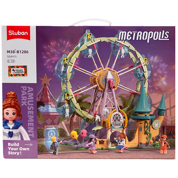 100% compatible with leading building brick brands! This amusement park Ferris Wheel set has 504 pieces included. Colorful retail box includes handle for easy retail carry-out.